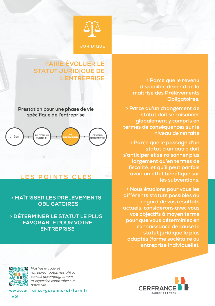 Nous étudions pour vous les différents statuts possibles au regard de vos résultats actuels, considérons avec vous vos objectifs à moyen terme pour que vous déterminiez en connaissance de cause le statut juridique le plus adaptés (forme sociétaire ou entreprise individuelle).