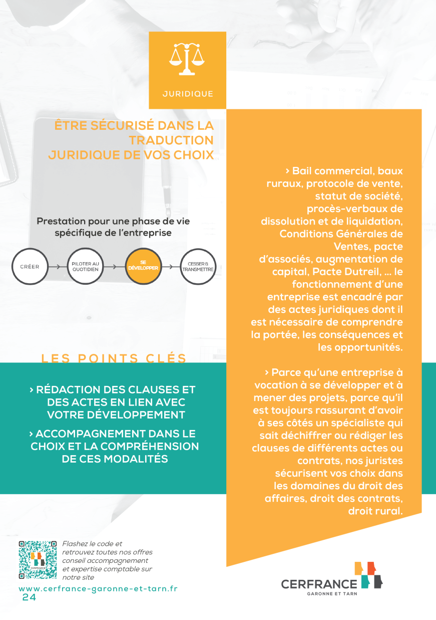 Parce qu’une entreprise à vocation à se développer et à mener des projets, parce qu’il est toujours rassurant d’avoir à ses côtés un spécialiste qui sait déchiffrer ou rédiger les clauses de différents actes ou contrats, nos juristes sécurisent vos choix dans les domaines du droit des affaires, droit des contrats, droit rural.