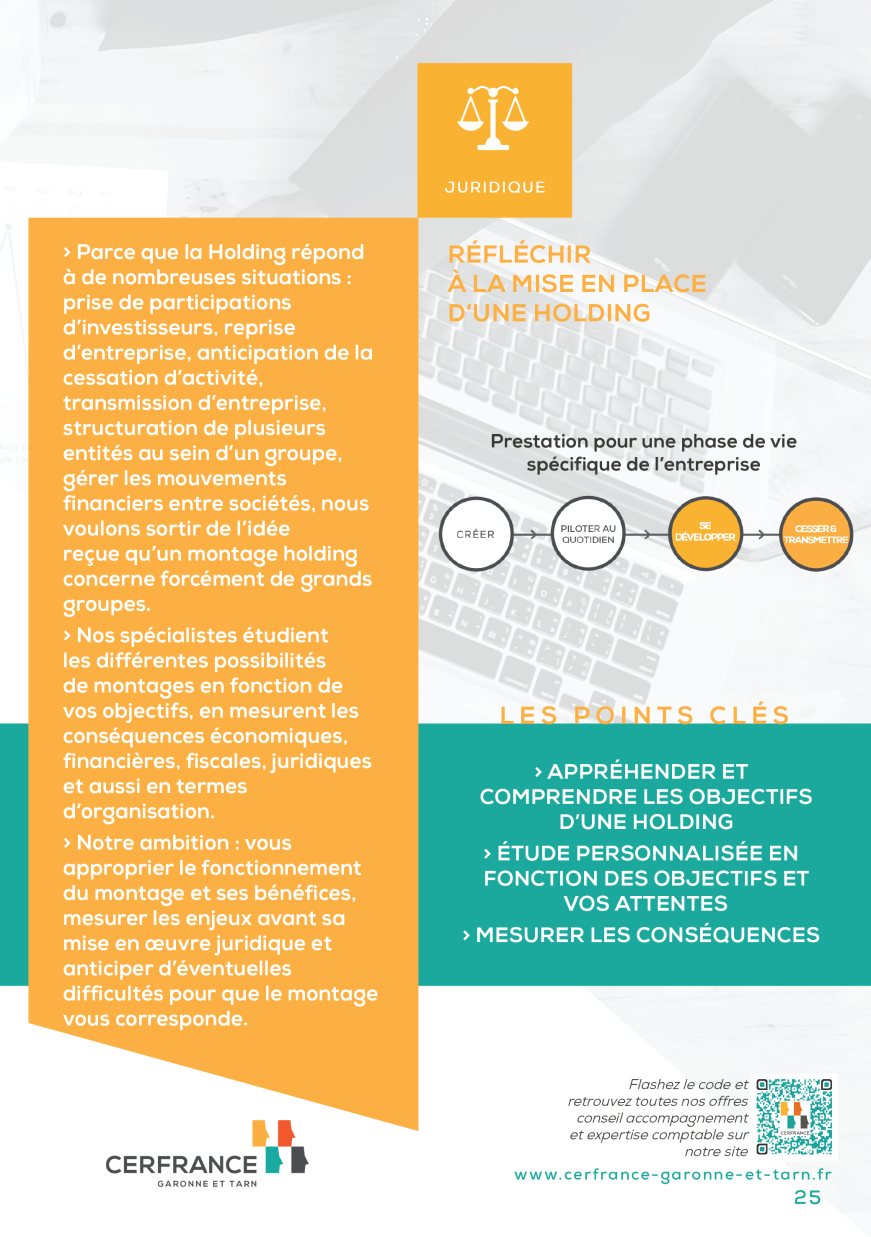 Parce que la Holding répond à de nombreuses situations : prise de participations d’investisseurs, reprise d’entreprise, anticipation de la cessation d’activité, transmission d’entreprise, structuration de plusieurs entités au sein d’un groupe, gérer les mouvements financiers entre sociétés, nous voulons sortir de l’idée reçue qu’un montage holding concerne forcément de grands groupes.